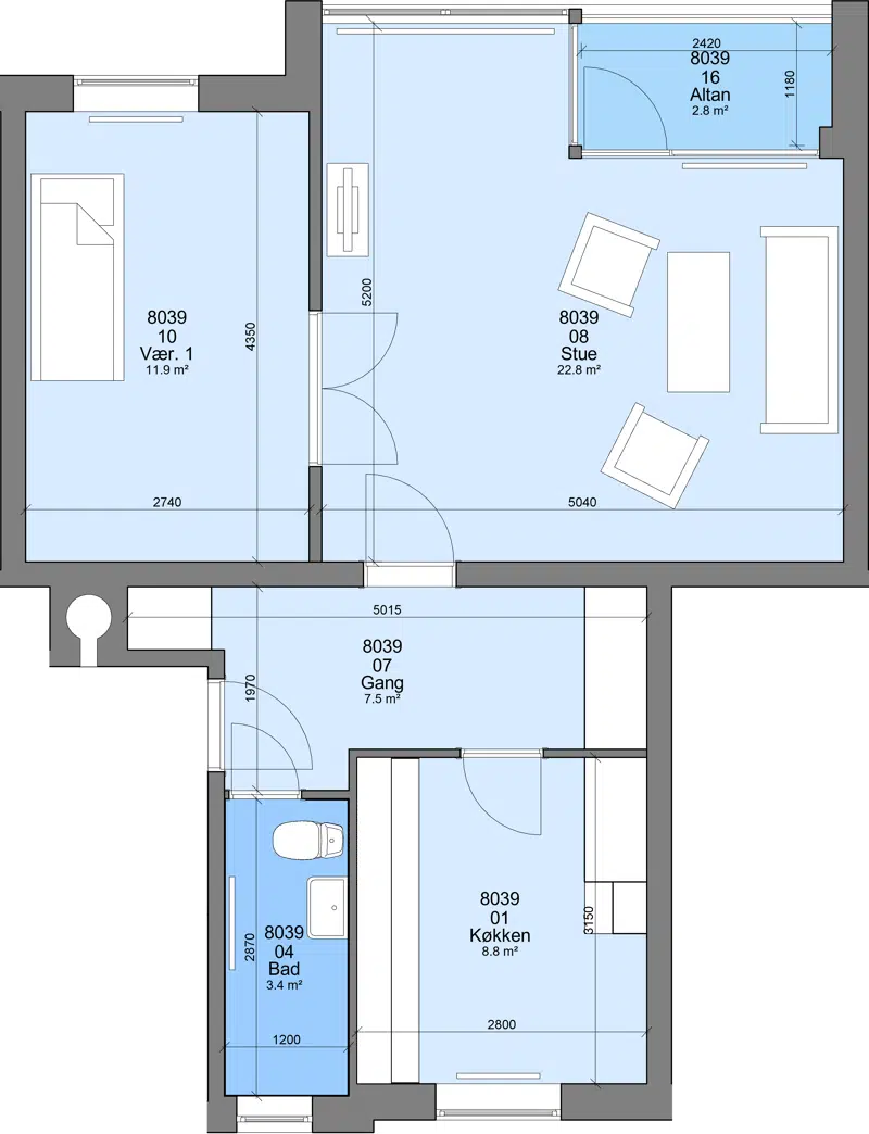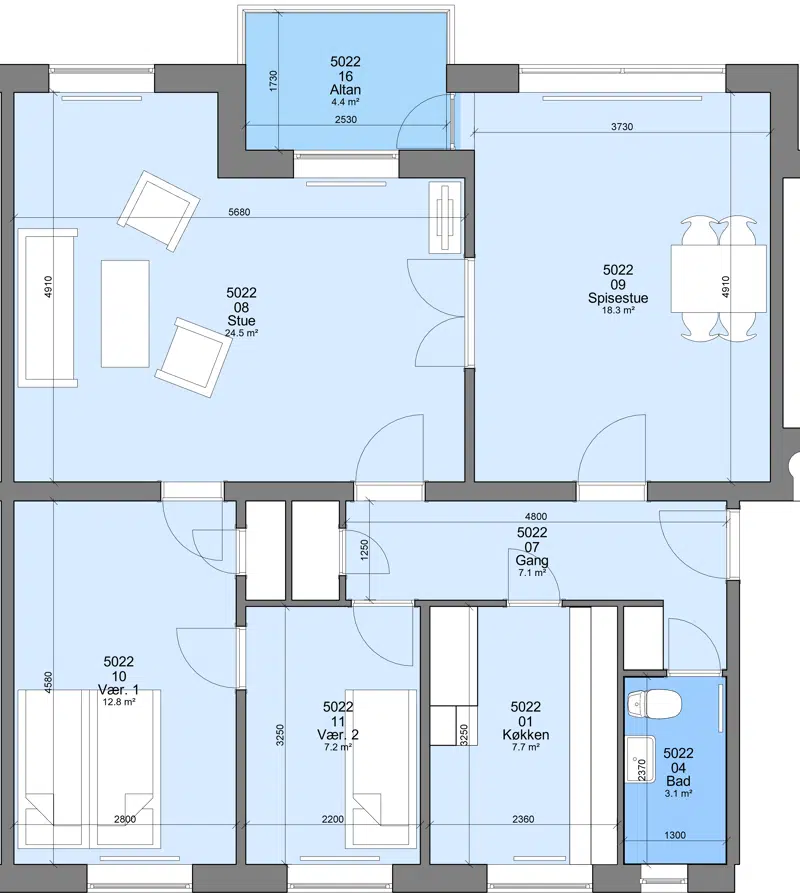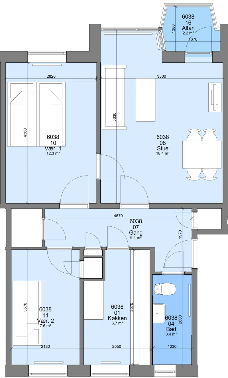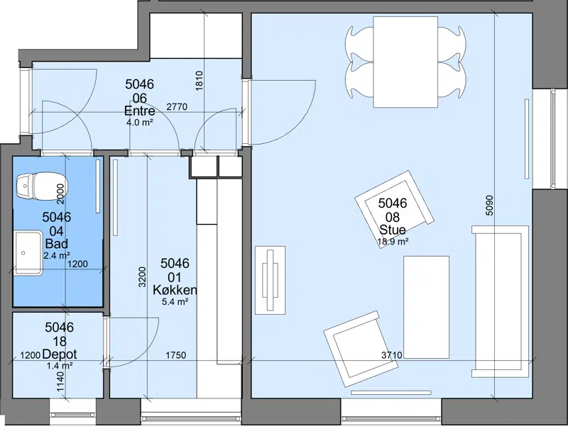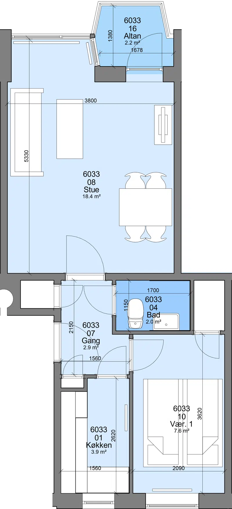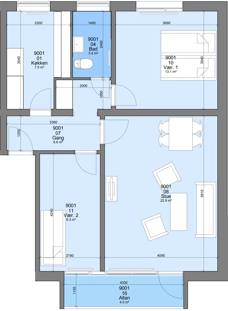 10 stk 1 rums 35-45 m2, 26 stk 2 rums 42-73 m2, 122 stk 3 rums 63-90 m2, 50 stk 4 rums 71-103 m2